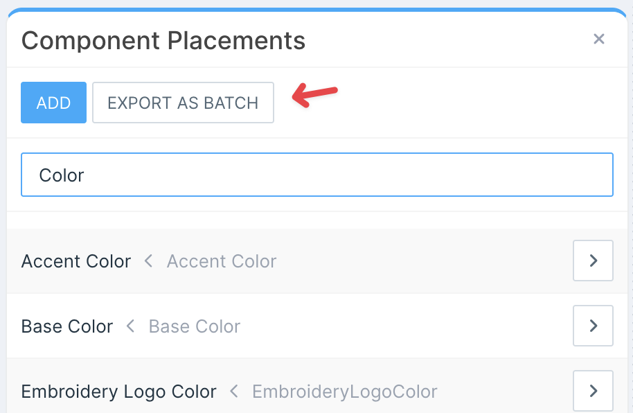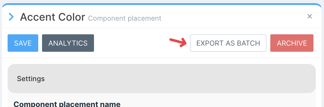 To export a single placement, navigate to the placement in the Customizer Admin editor and select Export as Batch.