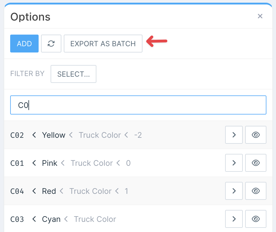 Similarly, component options can be exported individually by opening a specific option in the editor or in bulk from the list of all options. Note that a filter must be applied to enable the bulk export option.