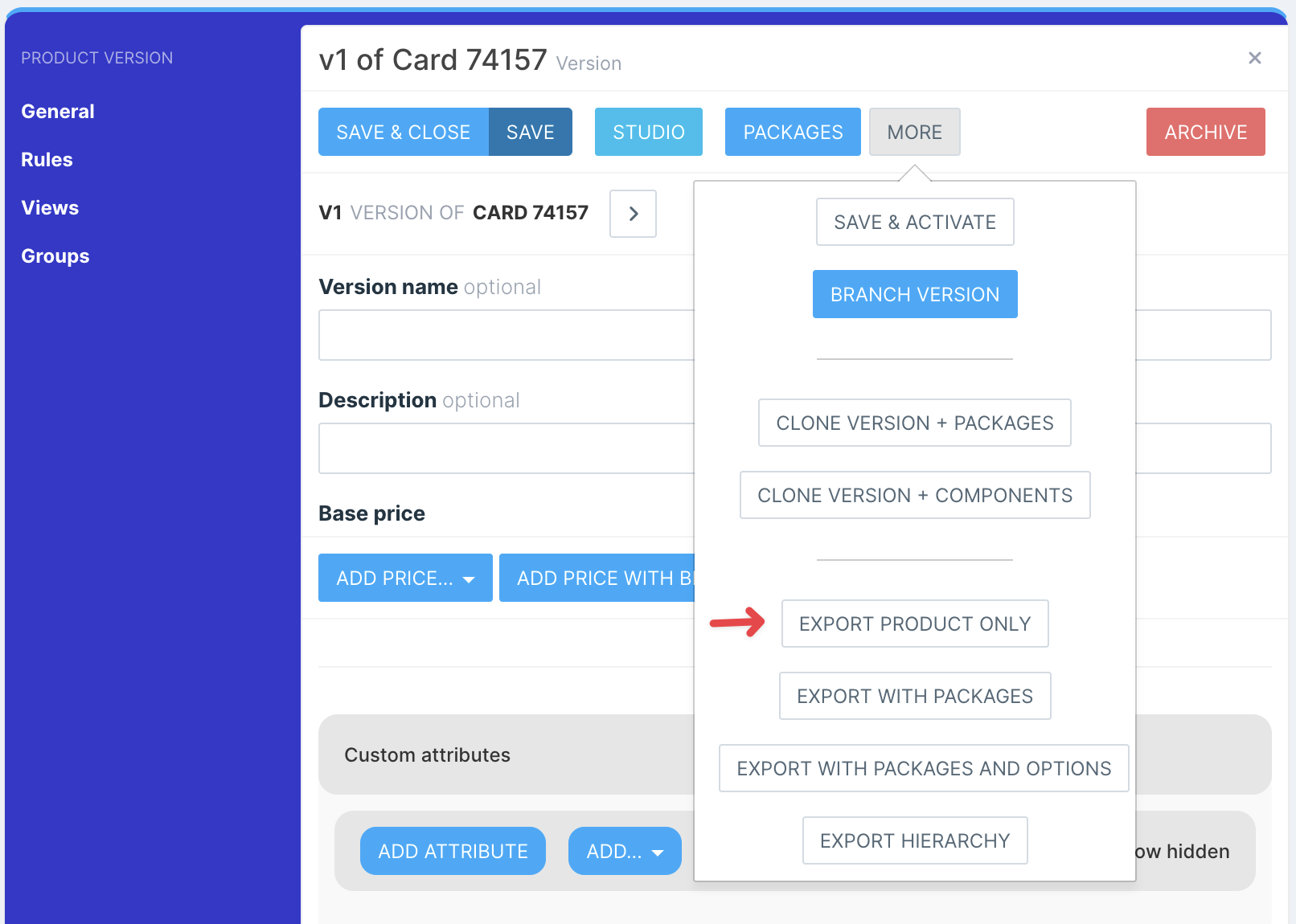 To export a product, navigate to a product version and select the desired option from the More menu dropdown.