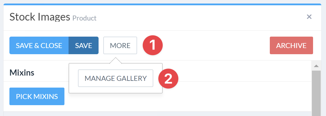 To open the gallery management panel, navigate to the product that is designated for holding gallery options, and select Manage Gallery option from the More menu.