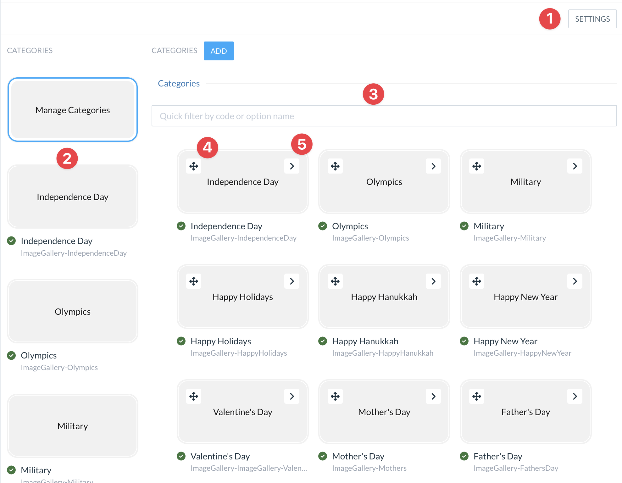 Category detailed list. The details list includes category cover images, name, and the enabled or disabled status.